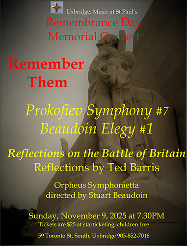 Remembrance Day Concert by Orpheus Symphonietta plus special reflections by Ted Barris on the Battle of Britain. Orchestra will perform Prokofiev